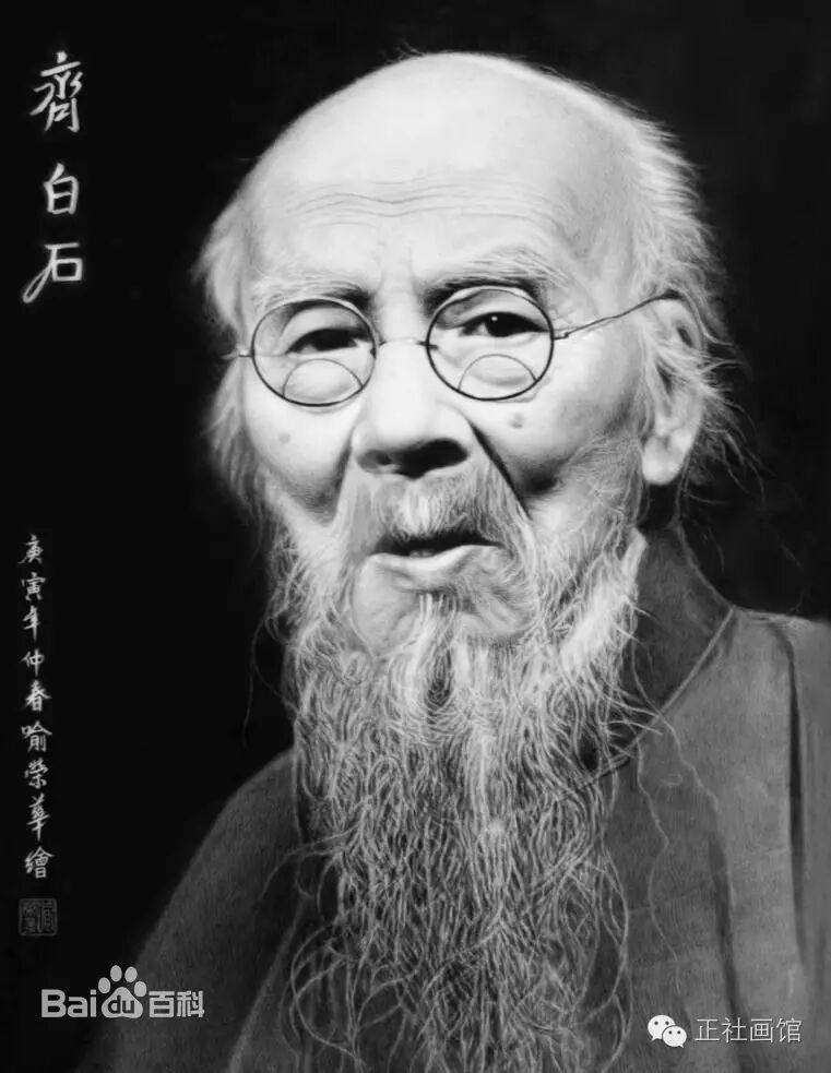 在笔墨上从吴昌硕入手,以近推远,至明代林良、吕纪、徐青藤、清代八大中吸取营养。白石书法以画入手,印章凭其雕花匠之刀工,单刀直入,土,乡土,本土,根,树根,民族之根在诗词方面转学多师,一下把中国画综合元素(诗书画印)溶合在一起。古人云,读万卷书行万里路,白石自五十岁后从湖南跑到京城开阔了视野,结识了陈师曾,在画上得到了进一步综合提高,适逢徐悲鸿慧眼抬爱,聘白石为教授,开辟了白石艺术的新篇章,否则白石或许一辈子是一个乡贤级的画家。