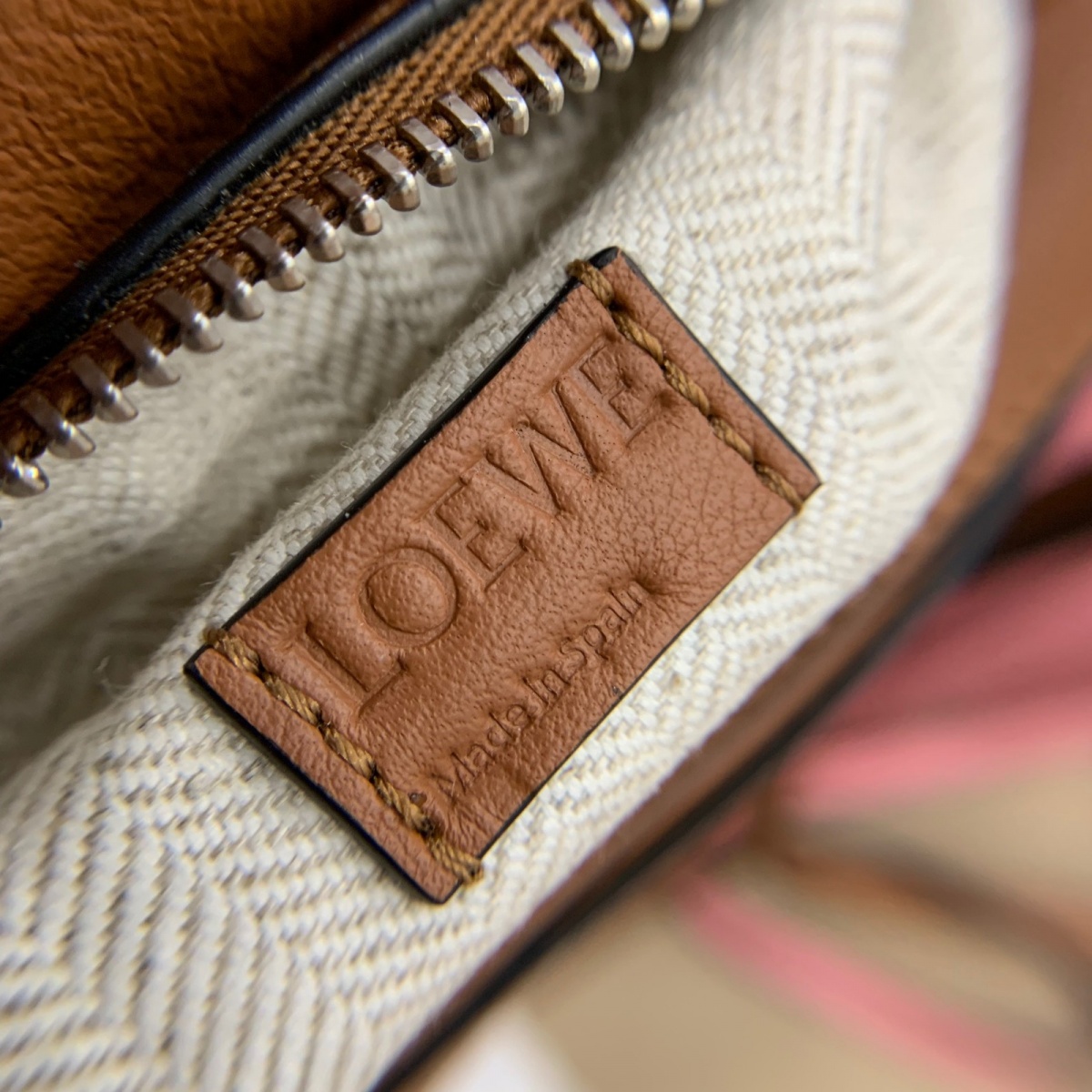 看下包内的皮牌logo,两侧缝线上下均匀缝到顶,logo压印清晰均匀,不会出现模糊的现象,字母O同样是内圈倾斜,顶端稍尖