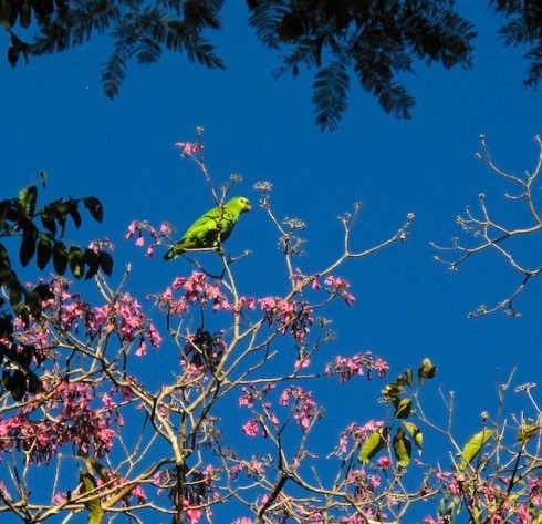 这是一只小鹦鹉,它们特别喜欢吃这种粉红色的花。