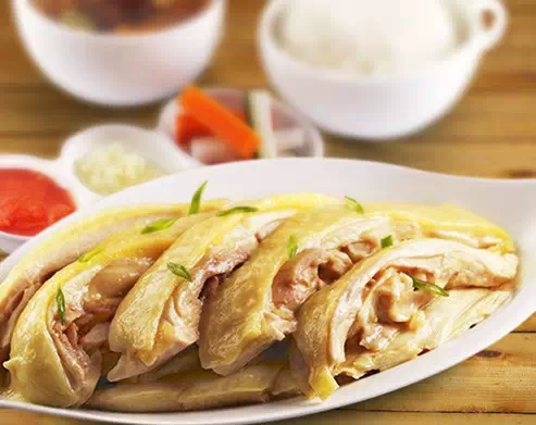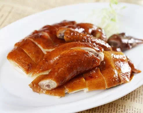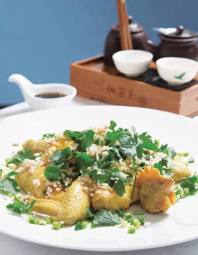选取广东清远鸡制成,每日空运。因地域、饲养方法不同,清远鸡因其肉嫩、细滑、油脂厚而著名,做出的脆皮鸡皮色金黄、肉质嫩滑、皮爽、骨软。