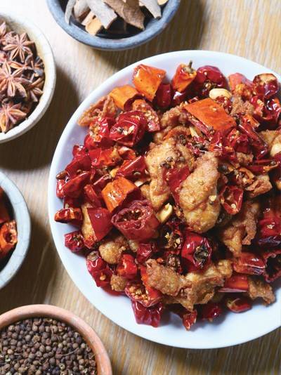 这道四川辣子鸡是在世纪100 里发现的,每去必点的菜肴,出品真心稳定而出色。选用香脆椒和海椒两种干辣椒进行调味。香脆椒能够起到提香的作用,而辣味温和的海椒不仅能给菜肴增添风味,还能食用以丰富菜肴的口感。辣子鸡每份重量在500 克,全部精选有机农场散养春鸡的鸡腿肉, 外皮酥脆并且完全吸收了酥炸后的两种辣椒的香辣风味,里面的鸡肉完好保留了肉汁,一口咬下鲜嫩多汁,也不油腻。