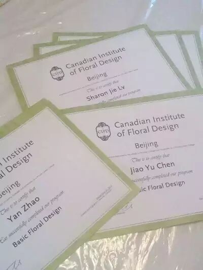 报名专业培训课程的学员在北京教室完成相应学习及考核后,将可以获得由加拿大花艺设计学院本院,在中国大陆地区唯一许可,由Toni