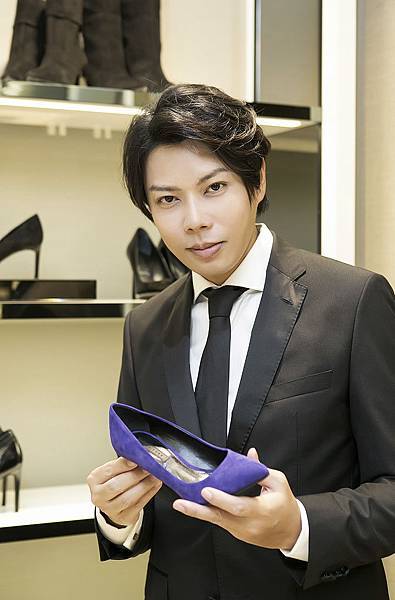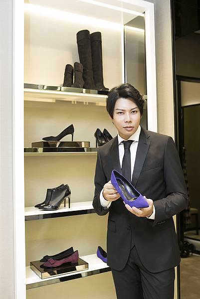 (在一片優雅的深色之中,手上這款紫色的尖頭高跟鞋顯得特別亮眼。)