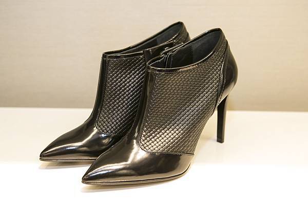 (不同壓紋與亮漆皮拼接的尖頭踝靴,讓黑色在光線照射之下有了不同層次。)