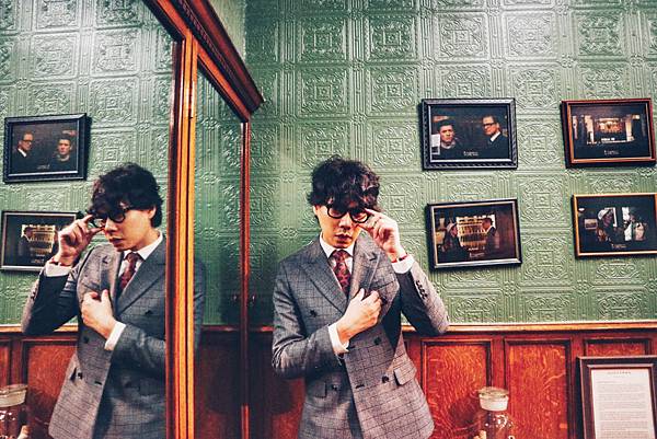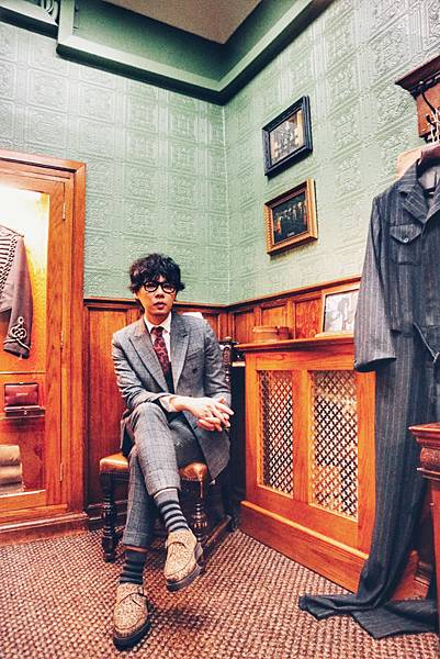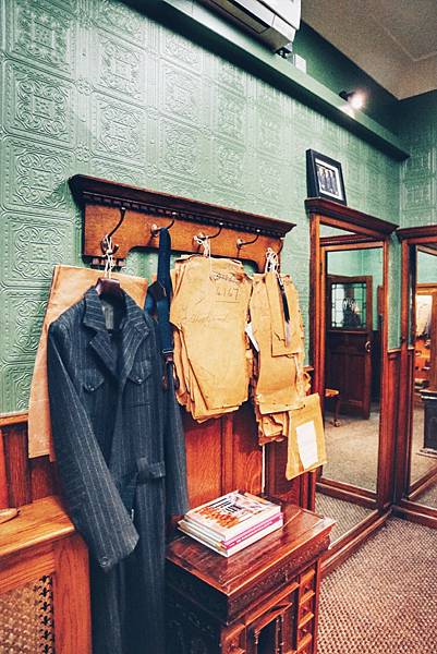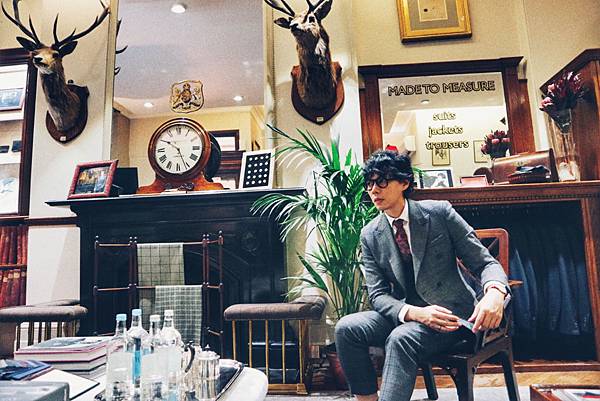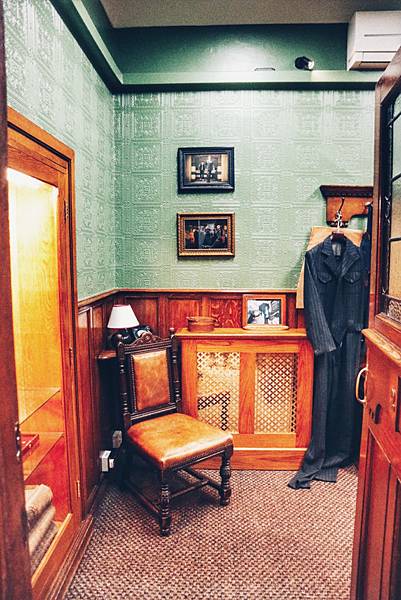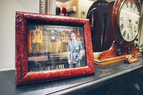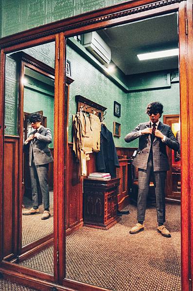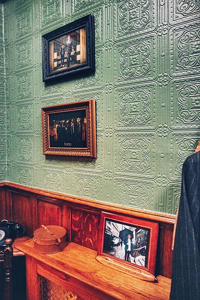 沿著店內右手邊走去的第二間更衣室,就是電影裡,泰隆艾格頓換上整身英式西裝,變身特務的更衣室。綠色立體雕花的壁紙與木造衣櫃、全身落地鏡相互點綴,牆面上掛著好幾幅電影的劇照,我戴著和柯林佛斯在電影裡一樣的「 Cutler and Gross」英國手工黑框眼鏡站在這裡,有一種虛實交錯的幻覺。