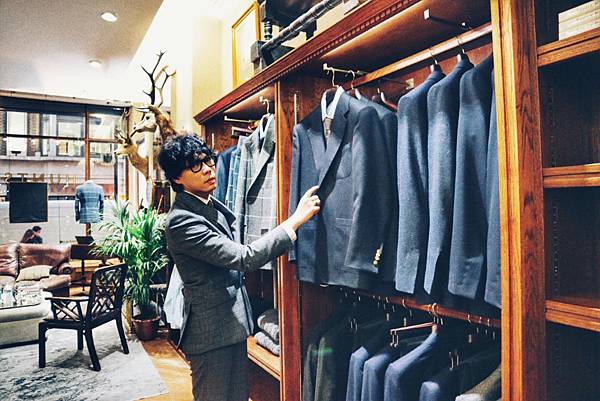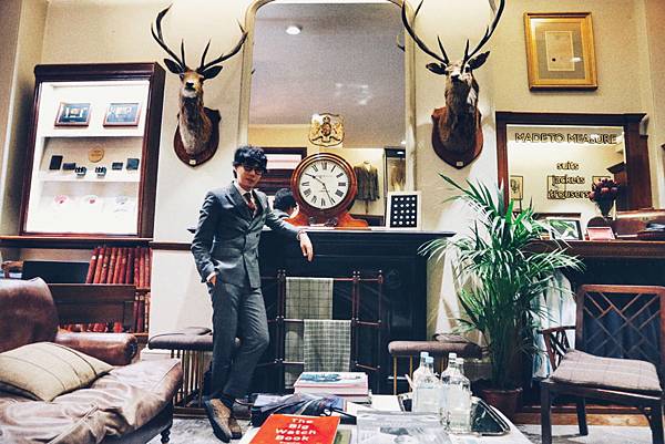 「這裡因為拍片的需要,用了這樣的色調裝飾,一般來說我們會帶客人到隔壁的更衣室換裝,肉眼看起來服裝的顏色會比較精準。」我的朋友,H.Huntsman & Sons的James跟我說。