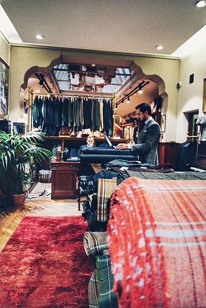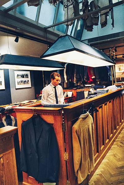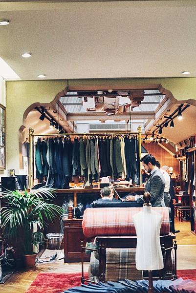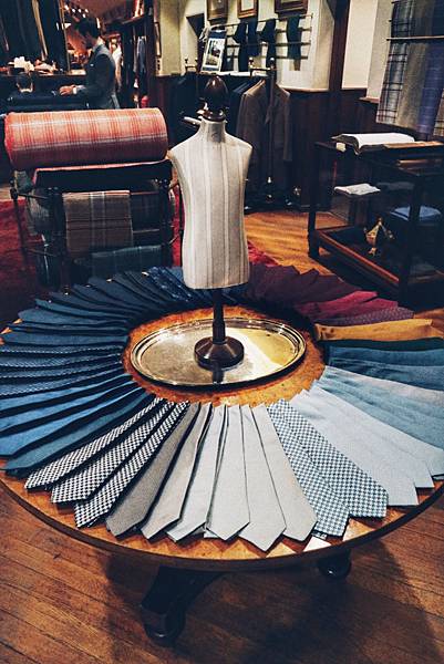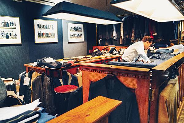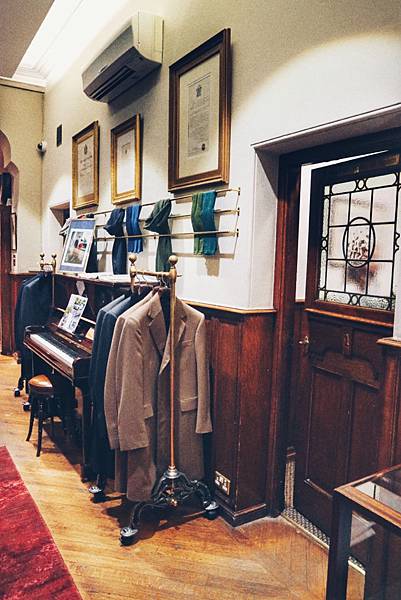 各種款式頂級面料的西服高高掛著,領帶、大衣、圍巾就像英國人一樣嚴謹有序地展示在眼前,裁縫師不斷地忙進忙出,這裡是紳士們的天堂。