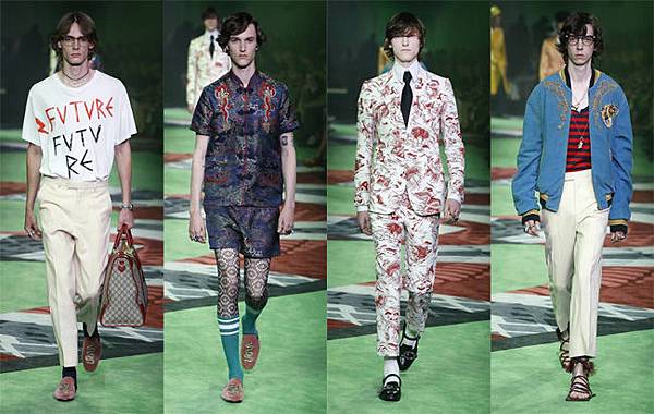 或許和我同世代的Alessandro Michele對「復古」有著同樣的感觸,在執掌的GUCCI 2017秋冬大秀上,刻意將中古世紀貴族的華麗剪裁、50年代的黑框眼鏡與印花外套、60年代的報童帽、70年代的民族風印花、80年代的牛仔丹寧與破損,每個美好年代的經典一一降臨在觀眾面前,六十多套男裝在霓虹燈下的時空隧道來回穿梭,滿足男人對復古的強烈佔有慾。