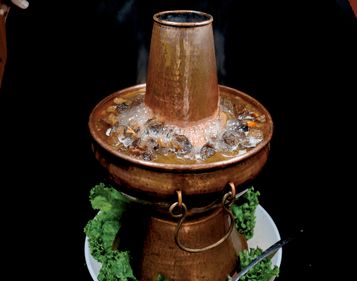 有别于市面上其他的酸汤火锅,“钤膳石锅酸汤”有三绝:酸汤、石锅和炭火。钤膳石锅酸汤源自黔南苗族古方。它内含几十种上好食材和调料,经自然发酵而成,酸爽香醇鲜,滋味独特,多一分则过,少一分则薄,恰到好处地犒赏你的味蕾,温暖你的胃。刚开锅时,舀一碗热气腾腾酸汤,满口酸爽。快结束时再喝上一碗,后脑前额微微出汗,唇齿间回味悠长……那销魂的滋味,让你欲罢不能,直呼过瘾。