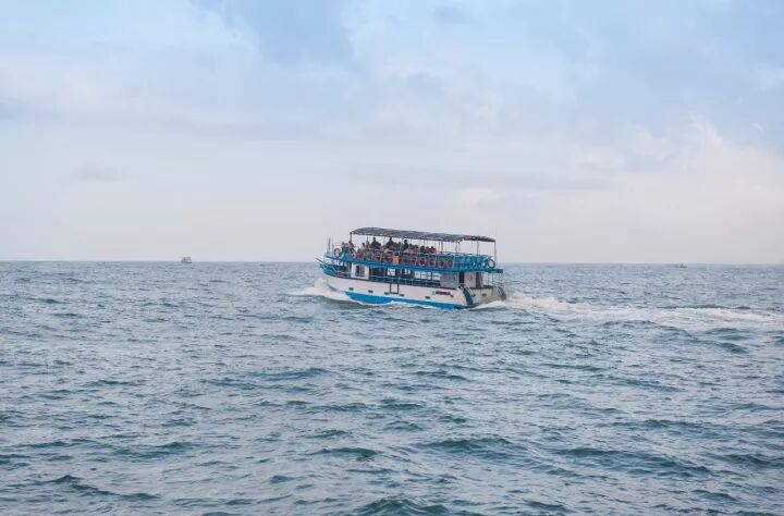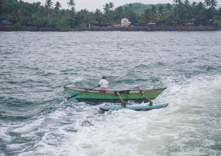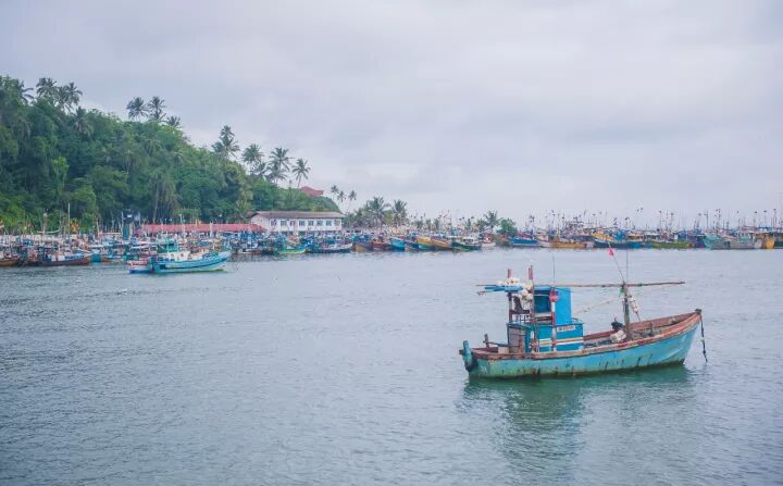 倒是一个好天气,天很蓝,米瑞莎海滩的美也渐渐地被看见了。码头上停着大大小小许多船只,色彩鲜艳明丽,岸边的树林繁茂葱绿,海水比想象中还要清澈,即便是码头,丝毫见不到被污染的痕迹。出发了,一切比想象中要顺利,至少心情还是不错的,船上的人们都很轻松地聊着天,看着远方。码头从视野里渐渐消失,我们的船也加快了速度向大海驶进。印度洋的海浪真的很大,激烈地与船只抗衡着,我越来越清楚的感受它的威力,船开始左右摇摆,溅起的水花直接扑到我们的脸上,来不及擦,又迎来了下一次。