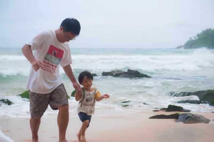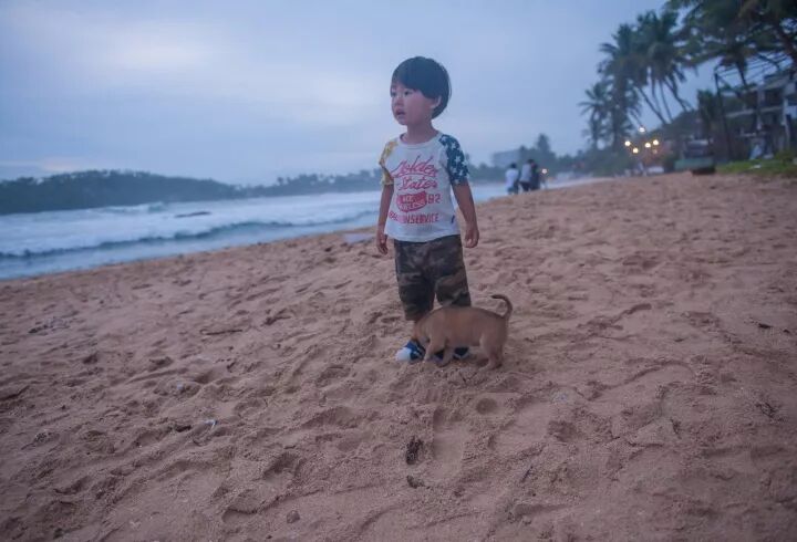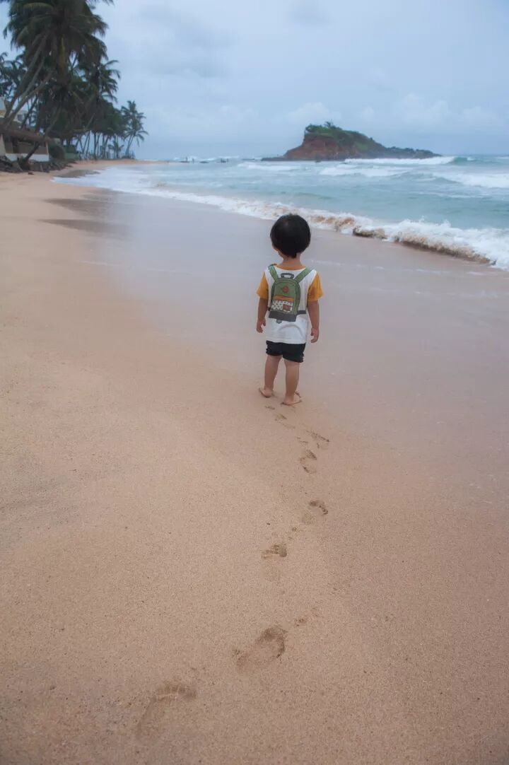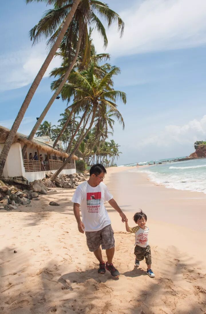 把鞋扔在一边,我们沿着海滩来来回回的走着,带着阳宝玩“躲浪”的游戏,这个游戏太适合在米瑞莎海滩玩了,因为这里的海浪总是这么奔腾和刺激,而这里也是不少冲浪爱好者的冲浪圣地。或许因为这里是斯里兰卡南部最晚开放的海滨,因此没有太多的开发项目,只有少数的酒吧,这里仍然保留着原来的生态环境,海滩很干净,海水也很清澈,有大片参差不齐的椰树生长在海滩旁,没有移植的痕迹,那么自然,那么自由。