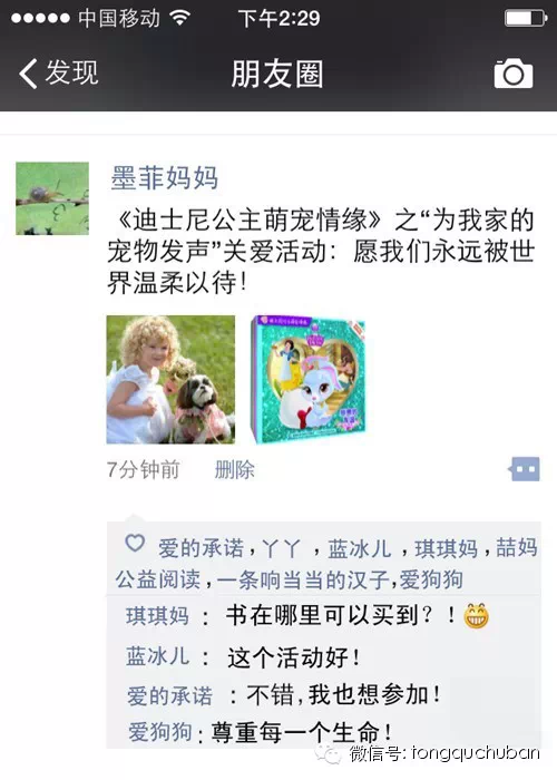 1、发①《迪士尼公主萌宠情缘》之“为我家的宠物发声”关爱活动 ②一句替宠物说的话 ③孩子与宠物的合影一张 ④《迪士尼公主萌宠情缘》图书套装封面至自己的微信朋友圈,并把此条微信的截图(示例见下方)发给童趣出版的官方微信号:tongquchuban或者发给喆妈公益阅读官方公众号:zhemagongyiyuedu
