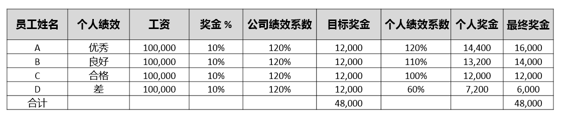 公司根据当年绩效结果计算,总奖金池为48000元。这笔奖金经过在不同绩效水平的员工之间重新分配后,最后总额依然为48000不变。但是,在绩效高和绩效低的员工之间实现了再分配,强化了奖金的差异,对绩效好的员工起到了更好的激励作用。