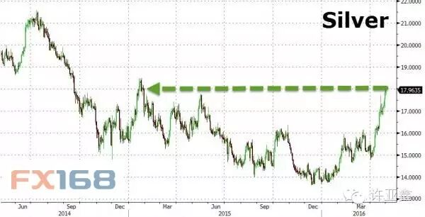 此外,现货银隔夜也一度触及去年1月来最高的18.01美元/盎司。