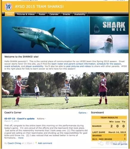 美国是用shutterfly.com这个网站组织活动,每个队都可以在上面定制自己的主页(免费),上面可以共享图片、查看训练日程和比赛信息、安排志愿者工作、访问论坛等等,这个网站还有对应的APP,非常方便。
