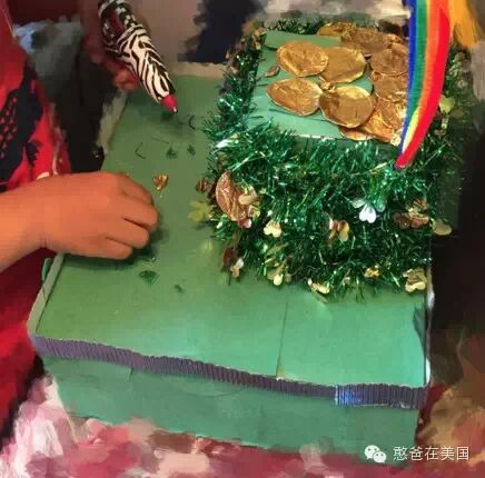 1. 我们买了一些绿色纸,胶棒枪,金币巧克力,金色包装带,找了两个空盒子,将盒子上都贴上绿色纸和包装带,打造一片草地和彩虹城堡。其中一个盒子中间挖空,做成一个陷阱,等Leprechaun不小心掉进去!:)