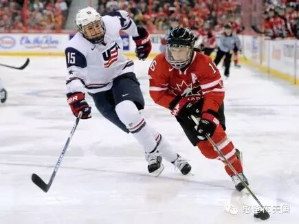 Hockey(冰球)是老美最爱的运动之一,运动员需要脚穿冰鞋,手拿球杆在冰上滑行拼抢击球,球一般用硬橡胶制成。比赛分为两队,每队6人,运动员需要用球杆将球击入对方球门,进球多者为胜。