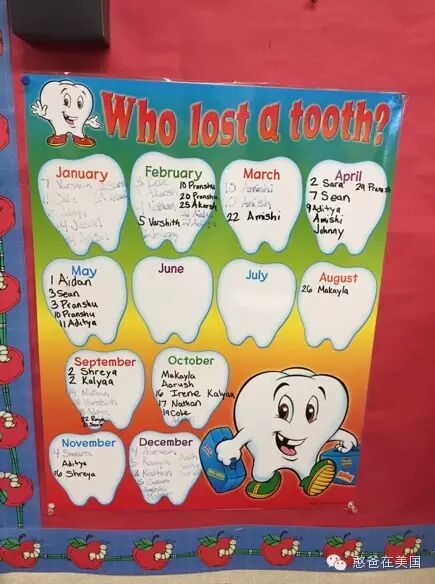 老师还为孩子们特意准备了一个掉牙记录表贴在墙上,谁掉牙齿了都在里面记录一下,然后小朋友乖乖把牙齿收好带回家,等着Tooth Fairy(牙仙精灵)夜里面悄悄给他们送礼物!