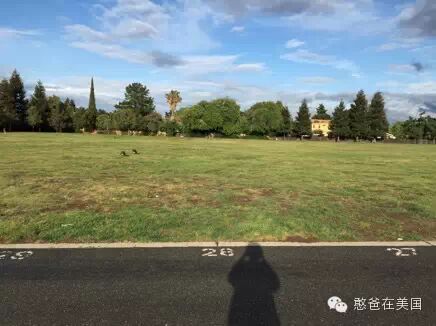 可是憨憨学校的操场是怎样的呢?请看下图。如果没有草坪旁的数字刻度,你估计很难想到旁边黑色的路就是跑道吧!草坪是真实的,有一对鸭子情侣悠闲的在草坪上啃着鲜嫩的青草,远方的球门时时刻刻地提醒我们,对,这草坪其实是个足球场。