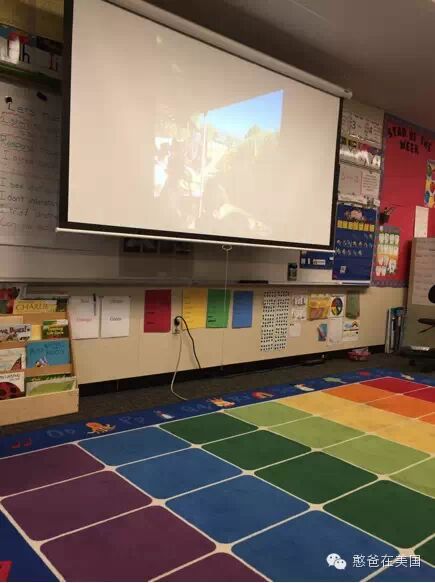 教室正中的一块区域安置了一个投影仪,地上铺着多彩的地垫,这是老师上课的地方,也是孩子们表演节目、演讲的场所。