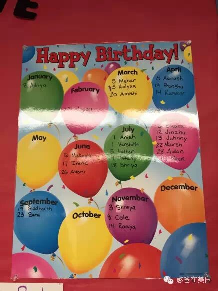这面墙上贴着每个孩子的生日,每逢过生日的时候,孩子家长会准备一些蛋糕带到学校和大家一起分享,同时还准备一些小礼物送给班级的小朋友。老师则会给小寿星戴上生日帽,所有小朋友围在小寿星身边唱着Happy Birthday的祝福歌曲,然后一起吃蛋糕、分礼物,小朋友别提多开心了!