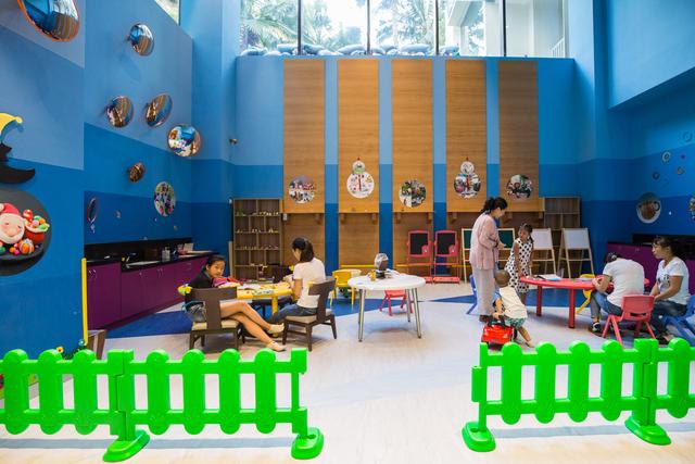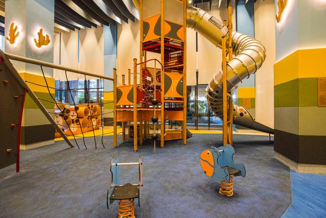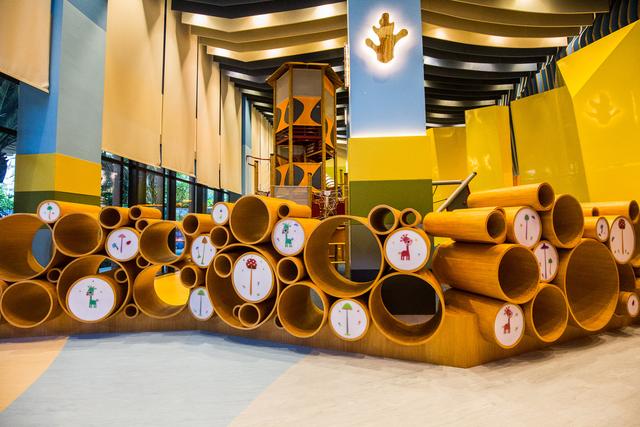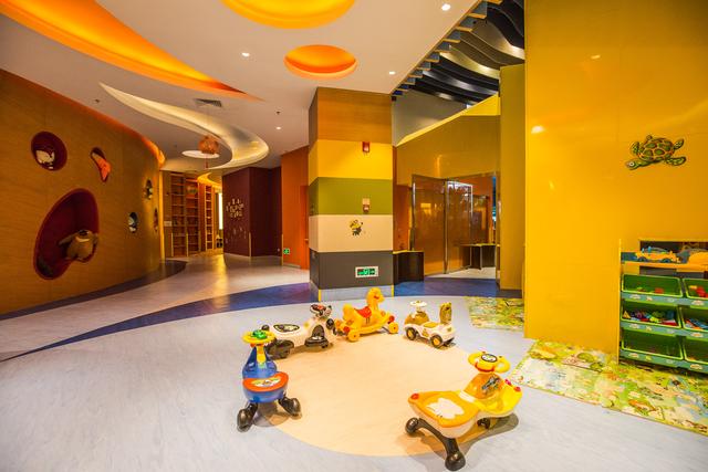 山海天万豪酒店儿童俱乐部是南海地区最受欢迎的室内儿童俱乐部之一,进入儿童乐园把我惊喜到,超过700平方米的空间大到惊讶,缤纷绚丽的色彩,卡通可爱的毛绒公仔和装饰让我少女心爆棚,这里包含阅览室、美术手工室、配备Play Station的电视室、午睡卧室、配备滑梯的活动室和儿童户外空间。满足了不同年龄阶段的大小孩的不同兴趣,小细节都做的非常用心,比如厕所的墙面都贴了可爱的卡通贴纸,门把手和边角的地方都装了防撞条,进去的无论大人小孩都要穿上袜子。女儿虽然还小,可是桌面上的玩具却让她兴趣盎然,还和旁边的小姐姐互动起来,想必每一个到这里的大人小孩应该都会喜欢这里。