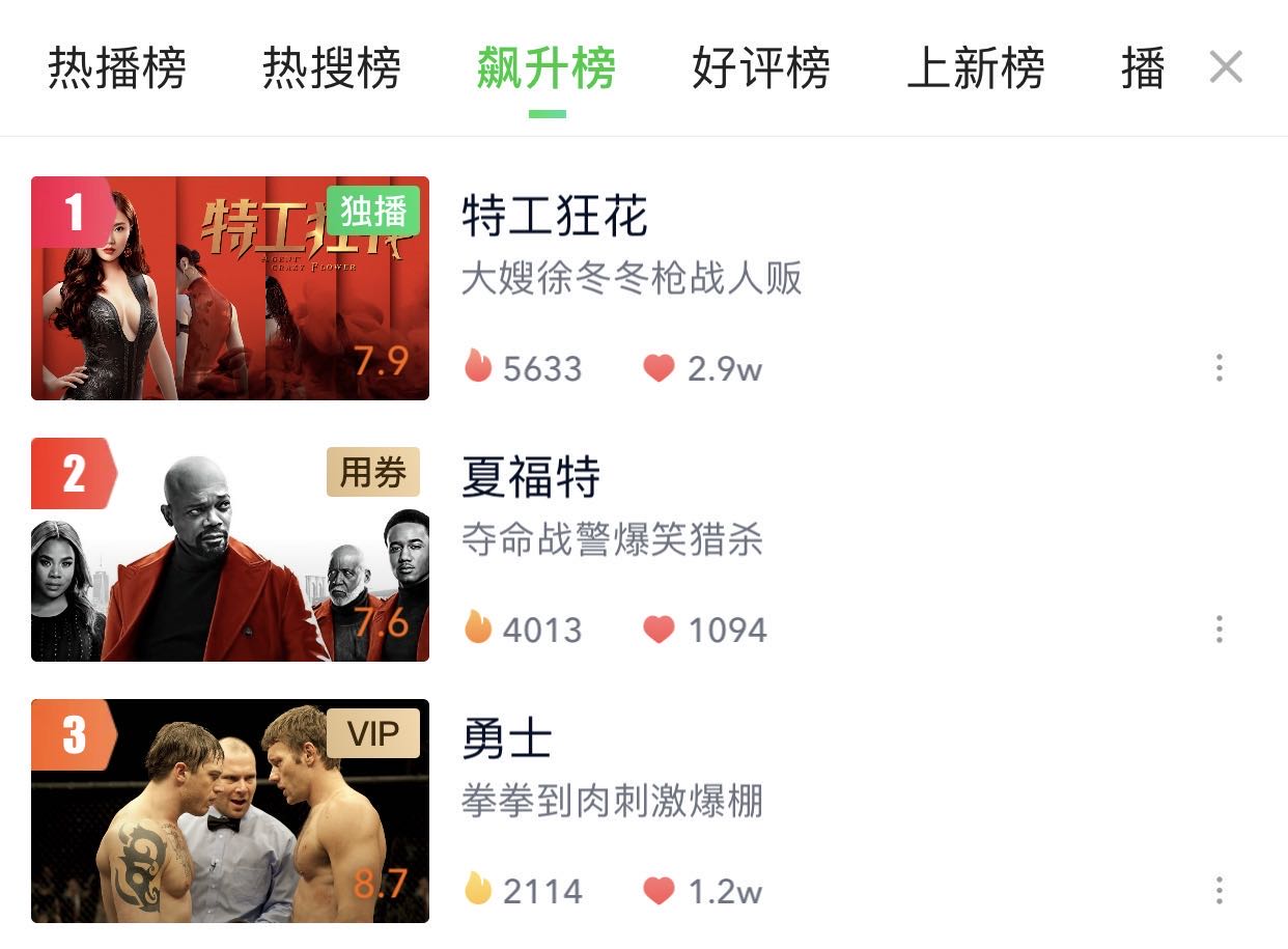 众所周知,今年的电影院是最难的,电影行业也遭遇了前所未有的冬天,最近因为《八佰》的上映,以及北影节的召开,关注网络电影的人并没那么多。《特工狂花》中最被观众熟知的就是“大嫂”徐冬冬了,因为她的加持,电影的数据始终也是一路走高的状态,目前在爱奇艺电影站内位列热搜榜第一、飙升榜第一等等,能有这样的热度实属难得。期待接下来这部片子走向更高的热度。
