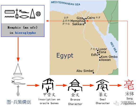 Walls)。孟菲斯象形文字中符号表示交叉十字路的村庄或城镇。在西方人给出的古埃及所有城市名字中都有这个符号,在对应汉字时这个符号不构成其对应汉字的组成符号。通过文字识别,可以判断孟菲斯的象形文字中的金字塔、口、角蝮蛇和心脏气管几个符号组合为“亳”字原型。孟菲斯古埃及名叫Ineb