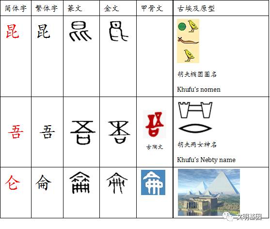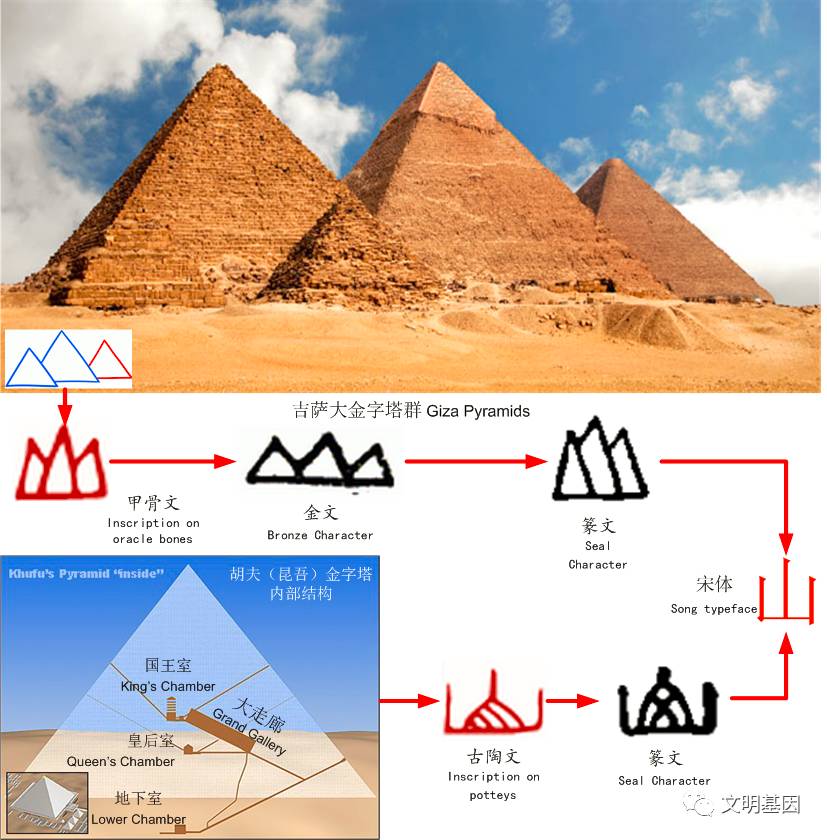 实际上最初“山”的字形就是吉萨三大金字塔的象形【2】,而不是自然山体的象形。从有的古陶文和篆文中的“山”字还可以看出连胡夫金字塔的内部结构都有描绘,对自然形状的山不会这样描绘。可见造字者是知晓胡夫金字塔内部结构的,也可旁证胡夫金字塔并不是外星人的创造,而确实为华夏先民而创造。《跨越三千年的因缘》作者根据宫玉海论证埃及金字塔就是中国记载的“众帝之台”,猜想吉萨金字塔群可能就是昆仑山,并指出胡夫的名字象金文的“昆”字,进一步,《因缘》考据中国记载古王号“昆吾”就是胡夫【2】。然而孤证不能证明,一些人说是牵强附会。实际上对文字演变确也需要有领悟能力。