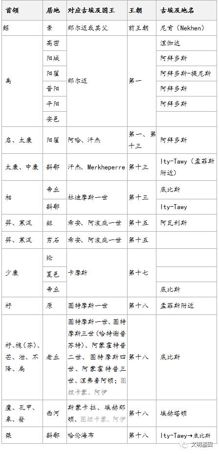 夏朝时期存在多次迁都,维基百科给出了夏朝首领居地变迁的一个表,这个表是遗漏了埃及早王朝、古王国到中王国时期大段历史的。删除其对中国地名的猜测,通过文字比较识别,可以很好对应古埃及都城地名。居住国王名字也可以对应,可形成两个维度的交叉验证。通过象形文字识别结合其他证据,可以证明鲧所居住的天子之城崇城就是位于上埃及的前王朝时期的一个中心城市尼肯(Nekhen),希腊文叫希拉孔波利斯,该城是上埃及保护神奈赫贝特的故乡。大禹所居住过的高密或曰密都就是尼罗河大拐弯处的涅伽达。阿拜多斯的名字为阳,提尼斯的名字为翟,两地相距很近,连称为阳翟,正是大禹建立夏朝后的都城。后来太康居住过的阳夏就是指阿拜多斯。第十三王朝都城在孟菲斯南部的Ity-Tawy,推测是斟鄩。第十四和第十五王朝时期的喜克索斯人的都城是位于尼罗河三角洲东北部的阿瓦利斯(Avaris),就是中国记载的 “东夷人”都城鉏。