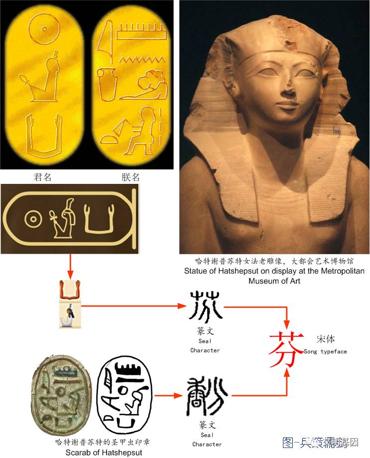 如果能证明哈特谢普苏就是帝芬,那么哈特谢普苏特神庙就是圜土就可得到证明。答案是肯定的,文字识别表明哈特谢普苏特女法老的王位君名正是“芬”字。她的简写和繁写两种形式的君号名字都可以在篆文中找到对应的“芬”字形。