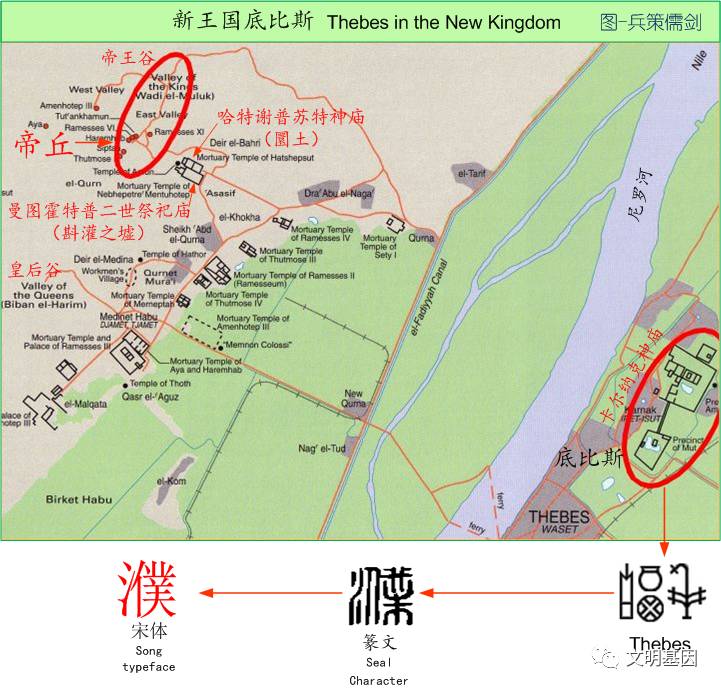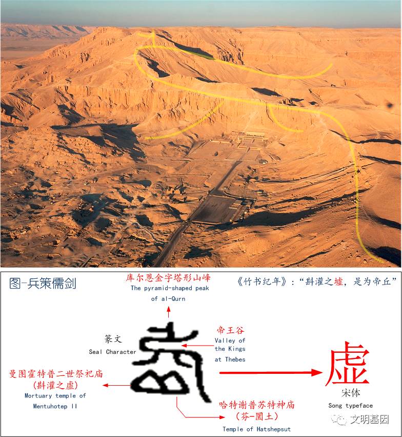 “丘”是萨卡拉金字塔地貌象形,“陵”是吉萨金字塔墓区的平面结构象形。“丘陵”后来连用转意用来指起伏不大的地形。做与之类比的工作,当查看帝王谷附近地形时,赫然就是“虚”字的象形原型。曼特霍特普二世的祭祀庙宇和哈特谢普苏神庙成为需字下半部分的典型特征。帝王谷的几条山脊线精准匹配需字上半部分。可见“虚”最早就是指新王国时期的帝王谷墓葬区,后来人们另造有土旁“墟”字来代表墓葬,而“虚”字本身多有转意。中国还有句成语叫“虚怀若谷”,这个谷最初可能就是指帝王谷。与“陵”、“仑”字类似,“虚”字并非埃及象形符号或符号组合形成的字,这些描绘地形的字形能否在埃及文物中发现还是未知数。甲骨文中也没有虚字,因为商人在中王国开始之前就已经迁移出埃及,商人没有机会见识中晚期时期的埃及-夏。这个字形成当在第十八王朝或新王国末期,或者已经迁徙到东亚的华夏族人回乡探亲,他站在卡尔纳克神庙上瞭望对岸的帝王谷,描绘下这个惟妙惟肖的“虚”字。