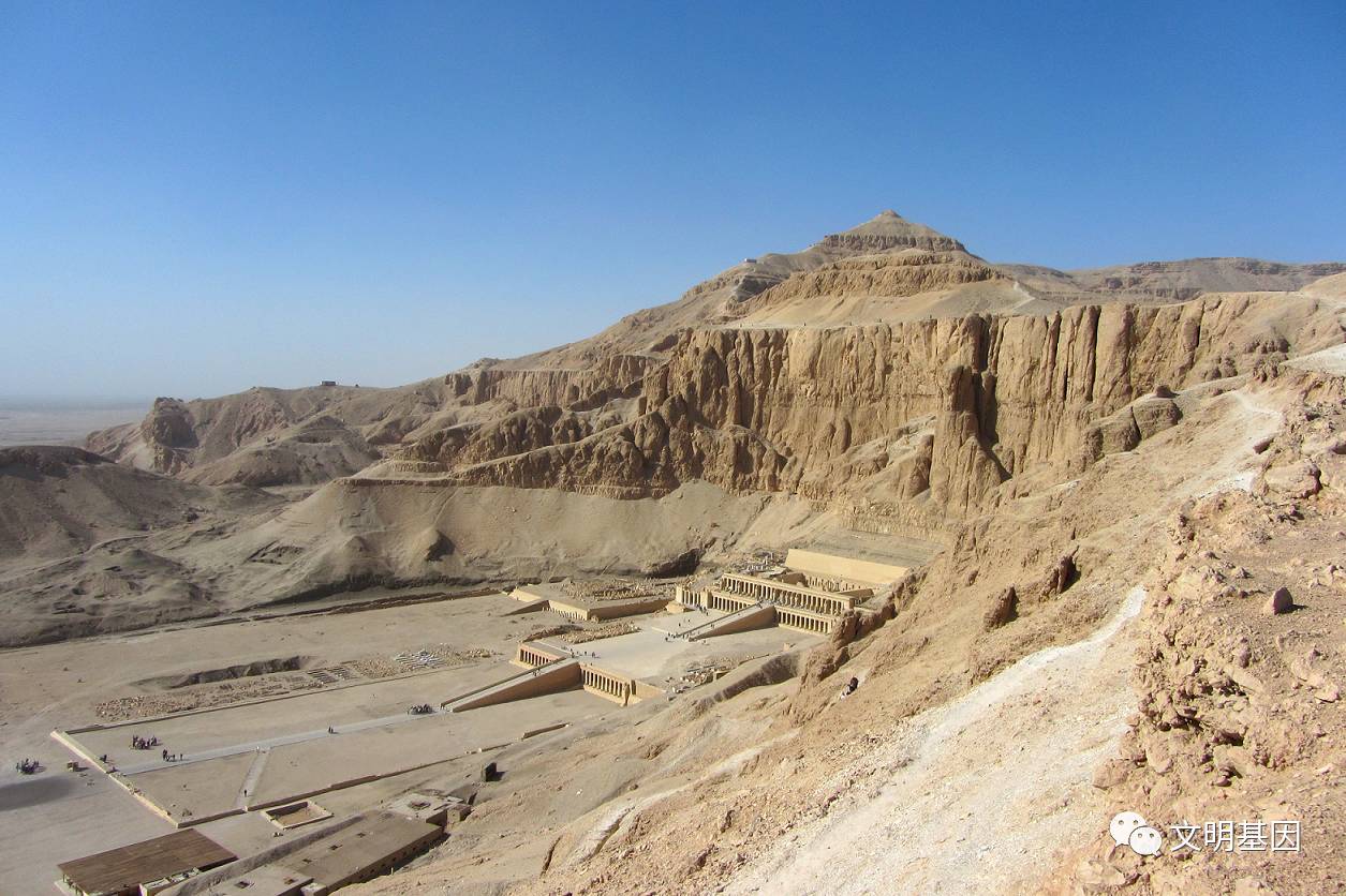 el-Bahri)修建有别具一格的祭祀庙宇,其顶部上层仍然为金字塔形结构。曼图霍特普二世是在古王国崩溃后重新统一埃及的明王,也一直都被视为一位半神半人的领袖,堪称大禹事业的继承人。他也是中王国的建立者和第一位君主。到新王国时期,墓葬习俗又有了很大改变,自雅赫摩斯一世之后埃及再也没有修建过一座金字塔,新王国时期的帝王选择了把底比斯西岸的金字塔形库尔恩山峰下的山谷作为隐蔽埋葬地,在山体岩石里挖掘墓道和墓室,此即为帝王谷。墓葬习俗的改变,暗示了从吉萨《连山易》到帝王谷《归藏易》的转变,有待深入研究。第十八王朝著名女法老哈特谢普苏特利用帝国财富开始大规模建筑神庙,她为了表示对曼图霍特普二世的尊敬,选择在达尔•巴赫里的曼特霍特普二世祭祀庙宇旁边建造她那气势恢宏的庙宇。达尔•巴赫里位于帝王谷入口附近,背靠帝王谷金字塔主峰,三面环山。女法老神庙中轴线与对岸卡尔纳克阿蒙神庙的中轴线基本重合,这个中轴线方位角是116½°,是按照天文对齐方式设计的,与冬至那天日出方向一致。