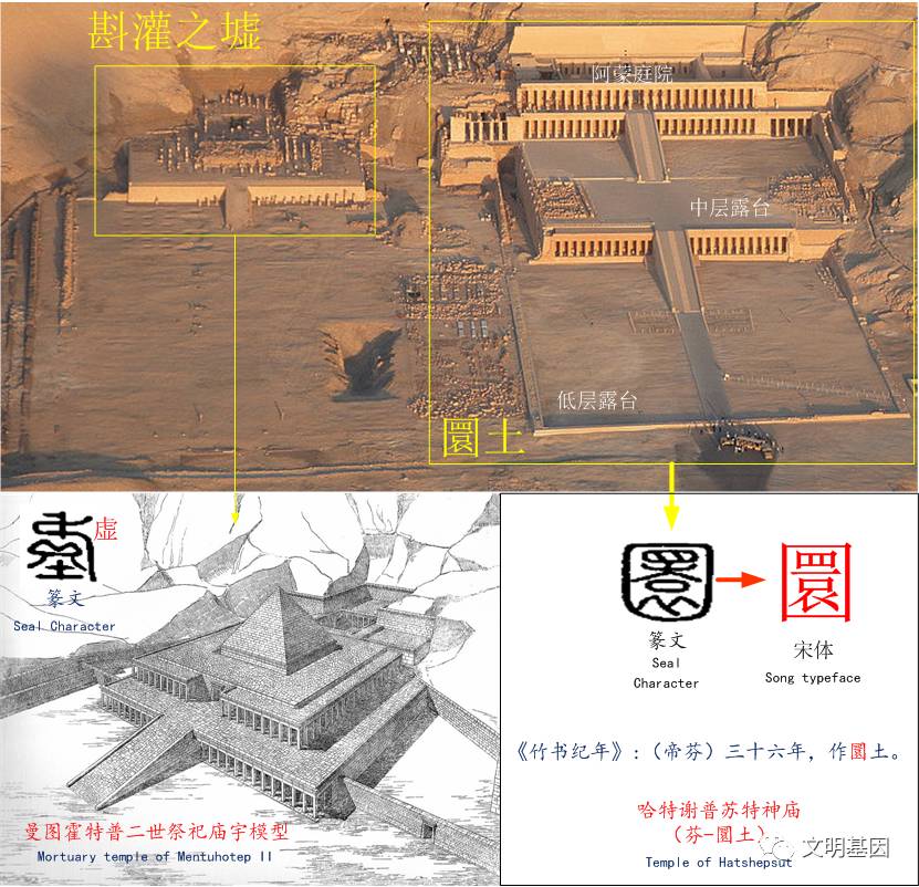 哈特谢普苏特神庙依山崖谷地,背后紧贴陡峭的山崖,呈阶梯状三层露台,大约有30米高。露台通过长长的斜坡链接。其中第三层与悬崖连为一体。极为宏伟壮丽,被称为“古埃及无与伦比的古迹”。《竹书纪年》记“帝芬三十六年,作圜土。”圜的本意是环绕。从圜的字形来看,与哈特谢普苏特神庙很相似。圜字圆圈里上面的“四”字形应是第三层露台廊柱的象形,下面似乎是斜坡和露台的象形。