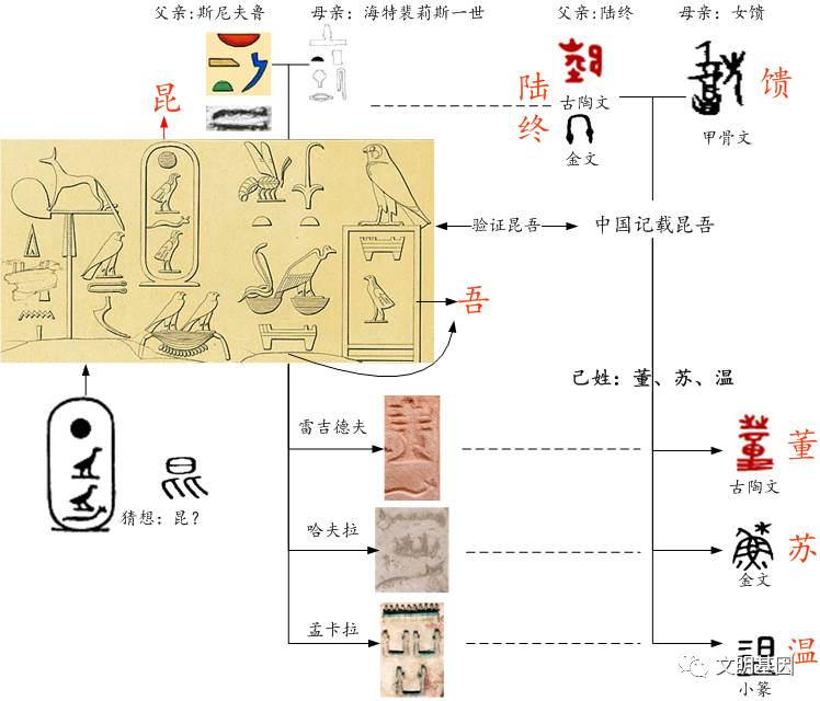 记载世系对比,再用名字进行比对,形成二重交叉验证,可以得到准确的科学定论。从世系记载看,胡夫的父亲斯尼夫鲁名字是“陆终”【11】,胡夫的母亲海特裴莉斯一世名字是“馈”【12】,胡夫三位继任者名字依次对应,雷吉德夫名字是“董”【13】,哈夫拉名字是“苏”【14】,孟卡拉名字是“温”。