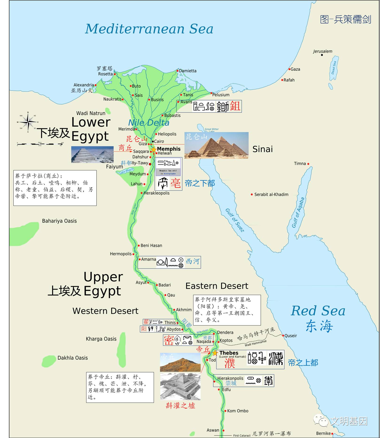 古王国崩溃后,经历了100多年的第一中间期。来自于底比斯的家族重新统一了埃及,他们以上埃及的底比斯为都城。此后中王国和新王国时期大部分时间内都以底比斯为都城,帝王和贵族墓葬区选择了在底比斯西岸。这样古王国时期的都城孟菲斯(亳)和附近的三大墓藏区萨卡拉(商丘)、吉萨、阿布西尔都出现衰落。位于下埃及的孟菲斯即《山海经》记载的“帝之下都”,与之对应,上埃及的底比斯可称为“帝之上都”。