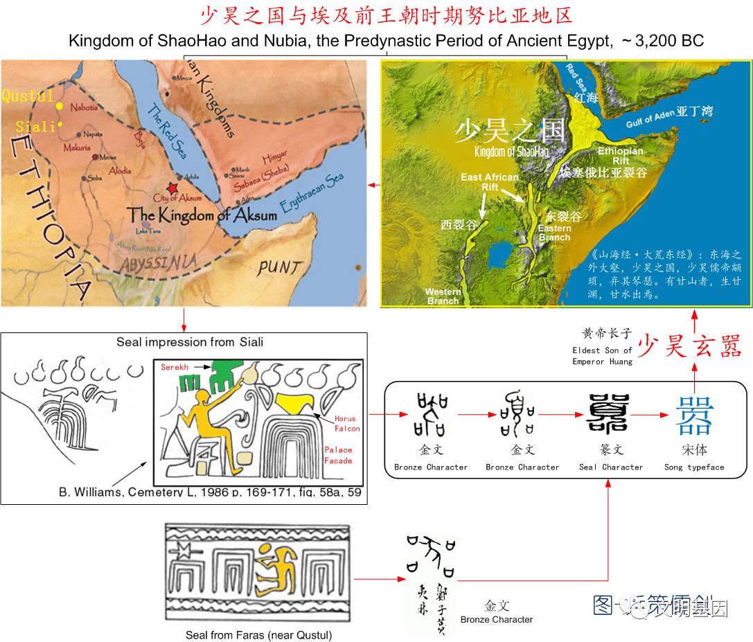 结合中国古籍记载,我们可以做合理推论:最初炎帝居于下埃及,黄帝居于上埃及。黄帝在统一上下埃及后,把他的大儿子玄嚣分封到埃塞尔比亚和努比亚一带传播文明。《山海经•大荒东经》载:“东海之外大壑,少昊之国,少昊儒帝颛顼,弃其琴瑟。”这里的大壑就是指东非大裂谷。红海就是古埃及的东海,红海之外大壑位置,正是埃塞俄比亚到肯尼亚一带。这里离努比亚也不远。上埃及统治者派人到这里建立王国是完全有可能的事,也是必须的事。周朝建立后,古埃及华夏族人可能大量迁居东亚,利比亚人趁机在埃及建立利比亚人王朝。努比亚人以古埃及文明传人自居,公元前7世纪左右,他们北伐推翻利比亚人统治,建立第25王朝,重新把埃及和努比亚连为一体。公元前1000年左右,在古埃及衰落时,以埃塞俄比亚为中心曾建立起阿克苏姆王国,最盛时版图包括红海两岸的大片地区,他们曾经长期掌握印度洋上季风的秘密,可能是古埃及华夏人经印度洋航行到东亚所掌握航海知识的传承。