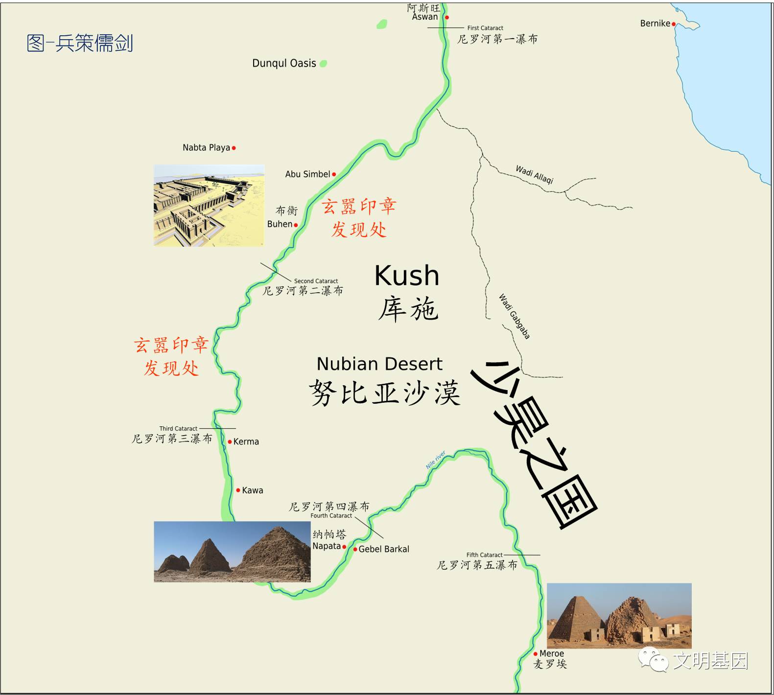 根据努比亚地区考古信息,努比亚地区出现文明时间大约与上埃及、下埃及出现文明时间同步。1960年,考古学家在努比亚Siali发现一个印章。印章年代在涅伽达III早期文化期间,这被认为是努比亚(或族群)前王国状态存在的第一个证据。画面坐着的一个人被认为正在举起他的手向前面代表“弓的土地”符号致敬。这个图案应是“嚣”字原型,应属于黄帝大儿子玄嚣的文物。金文“嚣”中间部分对应印章上的人物形象,人物旁的四个口字形对应印章上几个口字形符号。在努比亚Qustul发现的另一枚印章上的团案与另一种金文“嚣”字形相似。