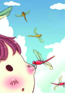 后来上了学,关于蜻蜓,我最早看到的古诗是“小荷才露尖尖角,早有蜻蜓立上头”。我们那里没有荷塘,但书上有插图,看到蜻蜓优雅地立在荷尖上,我想,这时的蜻蜓一定是最幸福的吧。等到我师范毕业后当了老师,学校让我负责成立文学社,我毫不犹豫地给文学社起名叫“小荷文学社”,校长和老师都说这个名字好听。文学社出第一期报纸要画插图的时候,我没忘了在小荷的尖上画一只蜻蜓,因为小荷有了蜻蜓的点缀才显得有生机。
