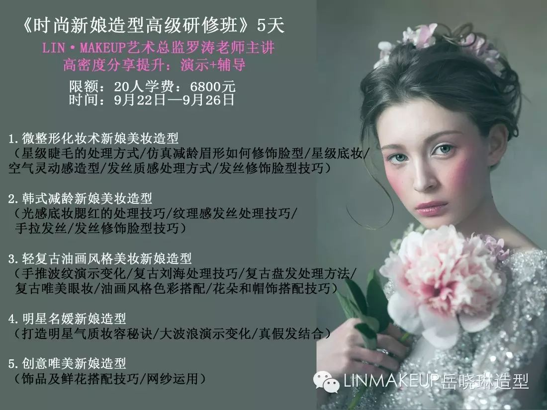 通知:9月22日——9月26日,《罗涛老师︱时尚新娘造型高级研修班》火热开讲,5天高密度集训,专业、唯美、实用,融入时尚理念多种风格新娘造型分享,演示+辅导,从根本解决造型困扰问题,快速突破传统理念!仅限20人!【5天/6800元】