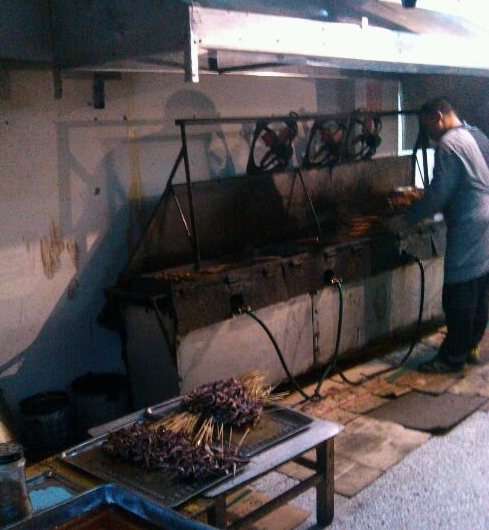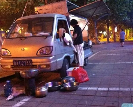 这家的标志是一辆机动三轮车,车厢改装成箱式,每次车还没来,这里就有很多开车的、骑车的、步行的食客在等了。车一停,大家一起帮着支摊,场面很是和谐。