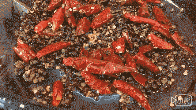 6、重新起锅加少量油小火烧热,加少量干辣椒与花椒,煸出香味后,关火铺在撒好芝麻的小龙虾上,淋上加热冒烟的热油即可