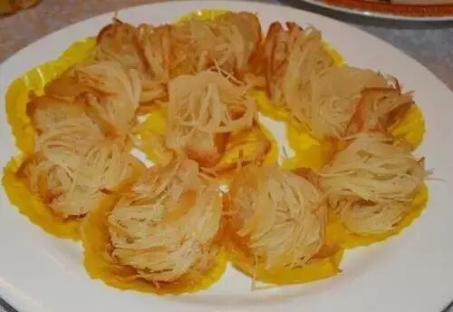 济南的清油盘丝饼相对来说比较清淡点,其是用花生油来煎烙的。盘丝饼外焦里嫩,金丝均匀,味甜爽口,许多济南人把当作为婚宴的点心。