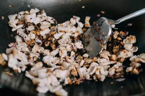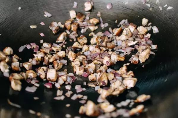 锅倒油,油热后,放糖小火翻炒,直到糖开始融化,加入洋葱。转中大火,翻炒一分钟。加香菇,炒几分钟。