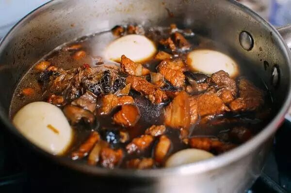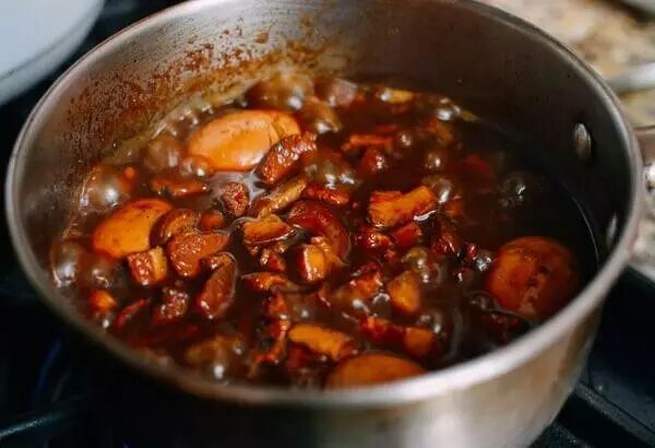 放五花肉,倒入料汁,搅拌,煮沸。煮沸后,放香料(装在茶包里)和剥好的熟鸡蛋,转小火,煮1个半小时,中间搅拌几次,防止粘连。