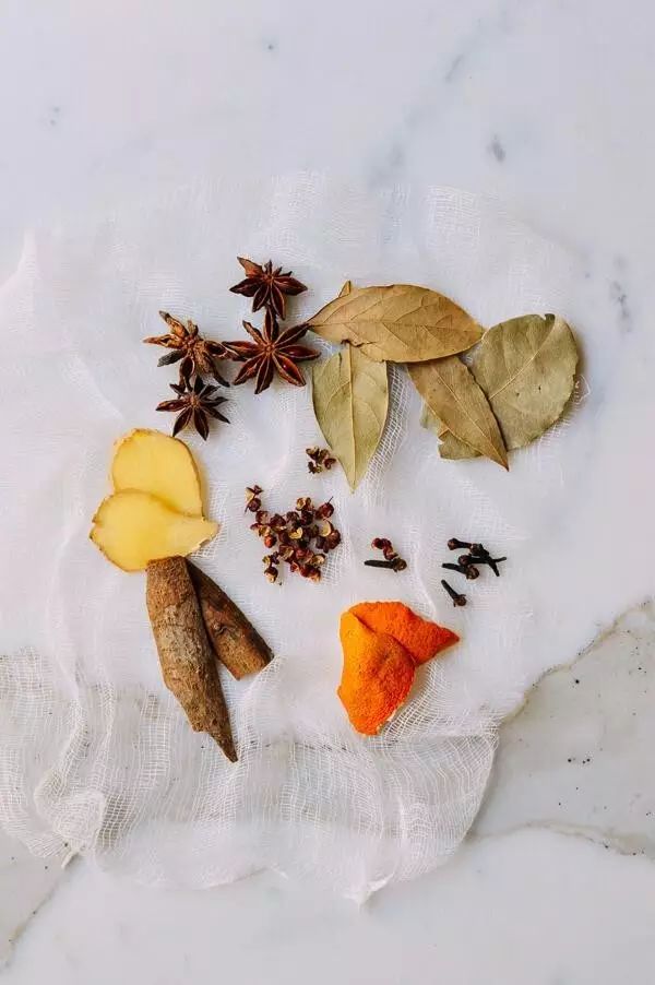 4个八角,2块桂皮,6粒丁香,4片香叶,2茶匙花椒,2块干橘子皮,2片姜。
