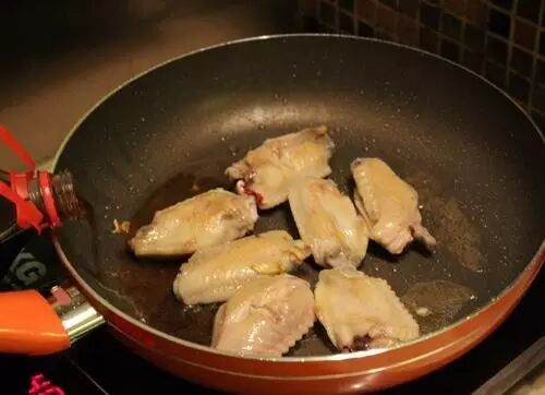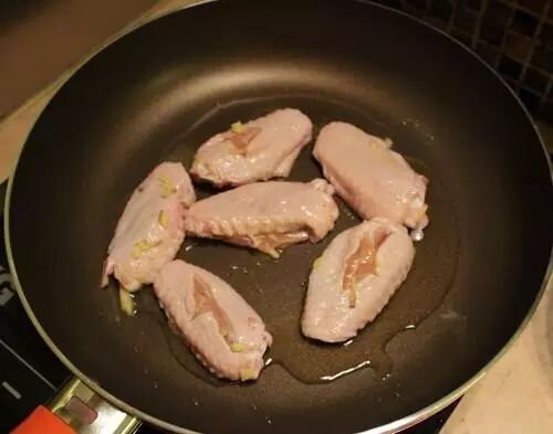 锅开中火,热油,煎鸡翅,将鸡翅两面都煎为金黄色。