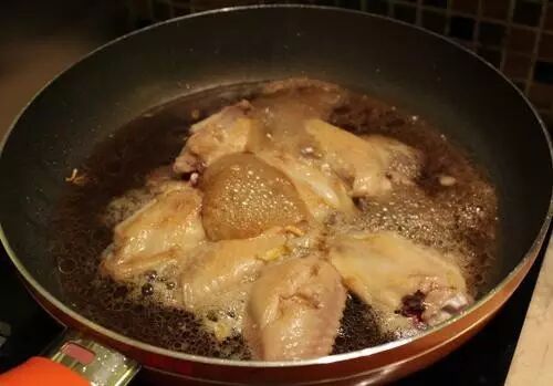 倒入可口可乐,改为小火煮,让鸡翅吸收可乐的味道。8到10分钟后,开大火收汁。