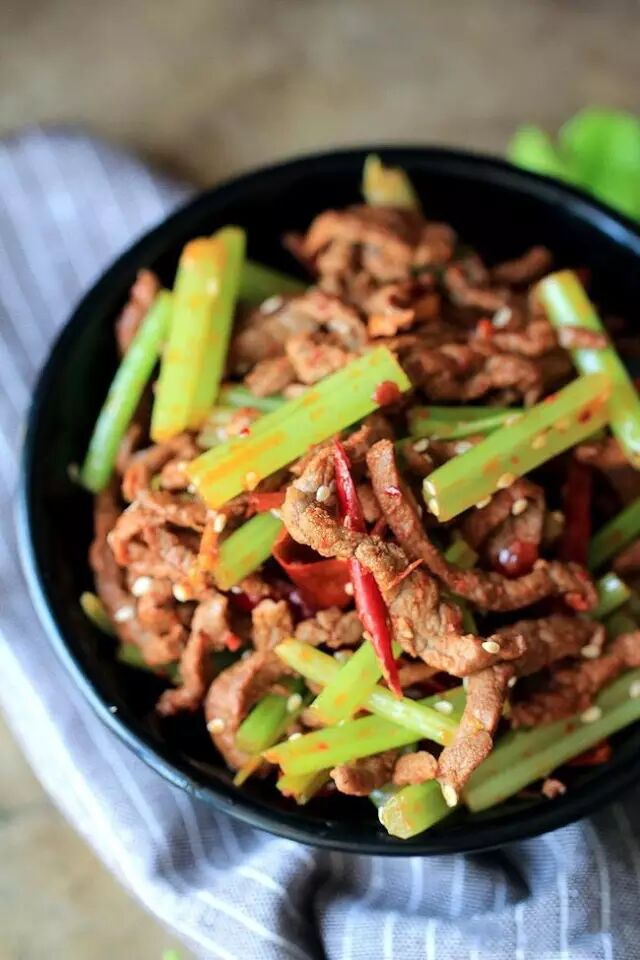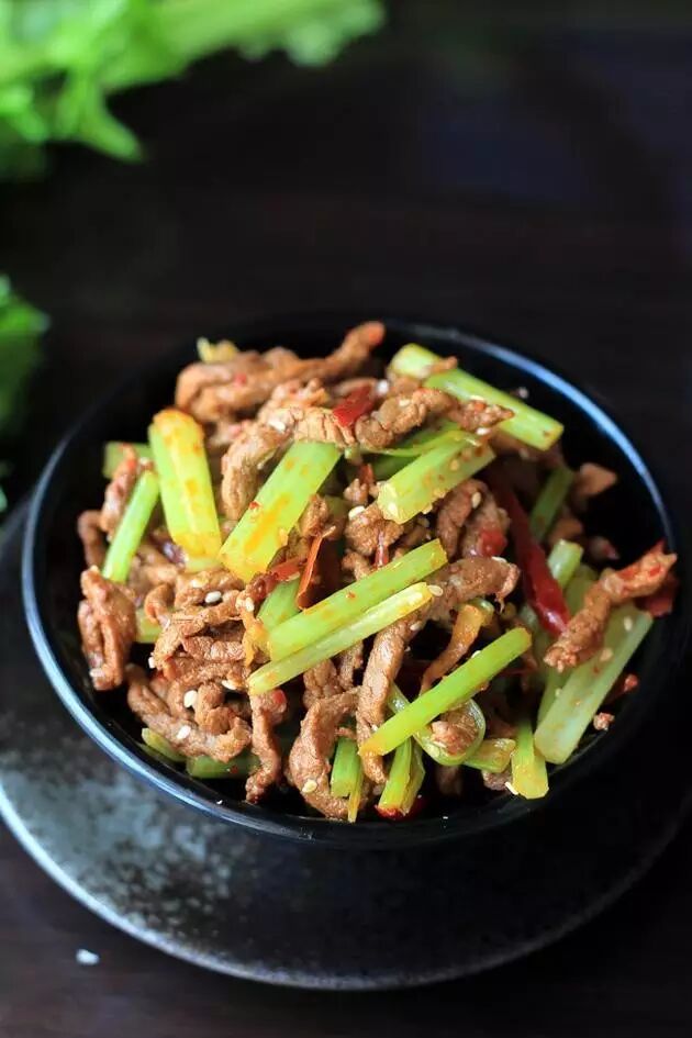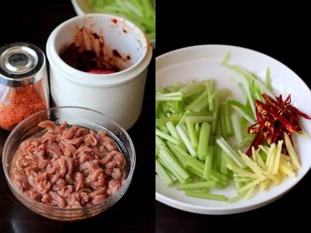 3.制作此菜,掌握好火候是成败的关键,牛肉丝一定要煸至水分收干,切不可水分太重,否则牛肉丝会软绵而不酥香;芹菜下锅炒熟了后要迅速起锅,否则变色不脆。