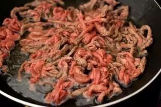 锅开大火,等锅热后倒入2汤匙油,油很热后,放入牛肉丝煸炒,待肉丝煸出水份后倒出,将肉丝沥干。